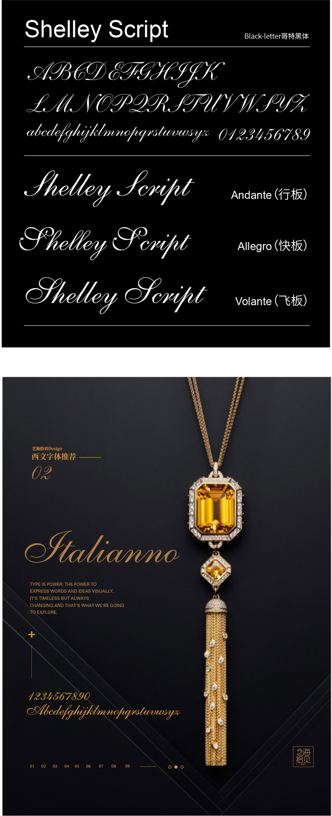 Shelley Script是一款非常经典的英国手写字体,流畅精致优雅如诗。三款字形分别模仿音乐的速度术语,命名为Andante(行板)、Allegro(快板)和Volante(飞板)。